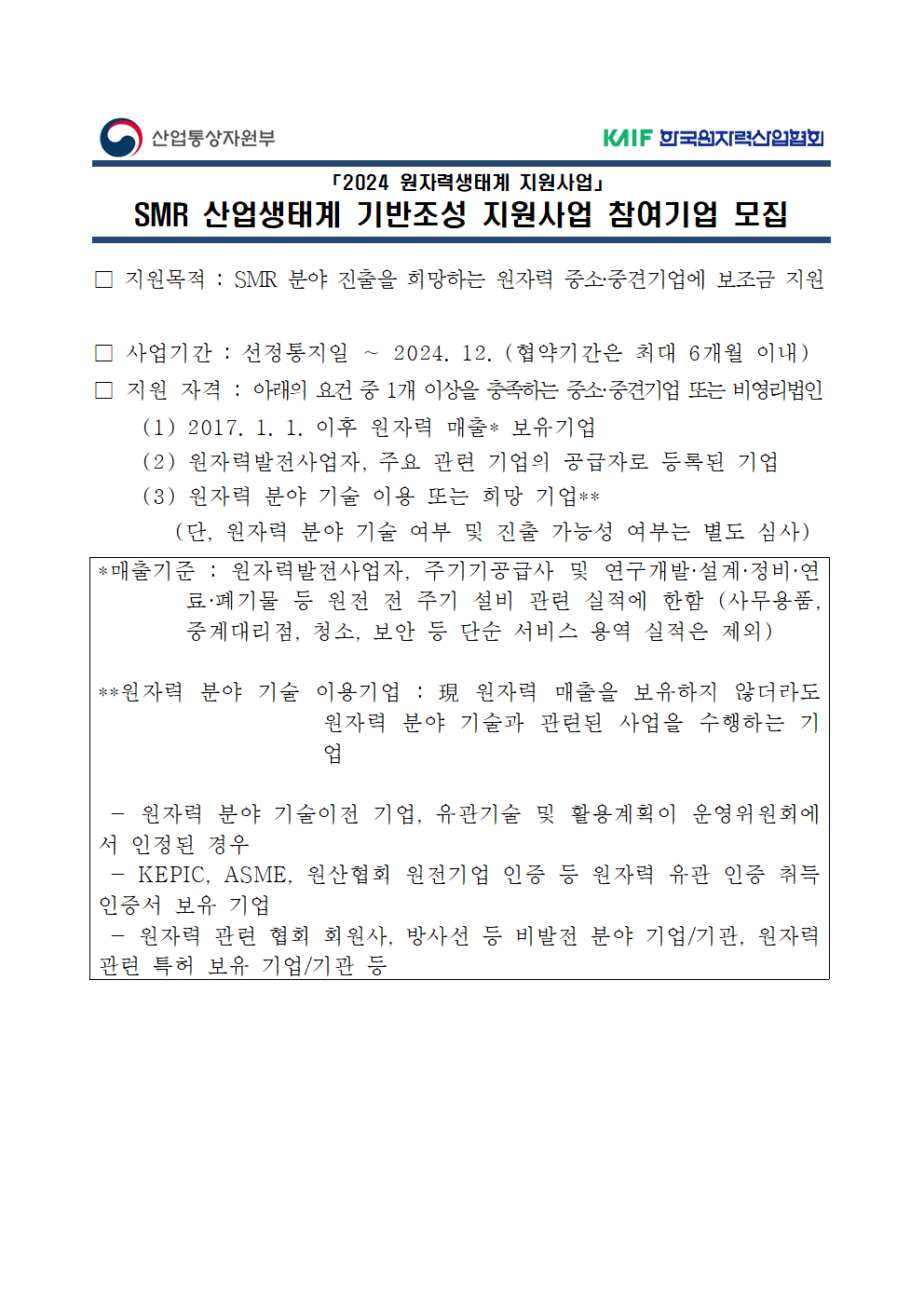 2024 SMR 산업생태계 기반조성 지원사업 참여기업 모집 (5차) (~ 5. 31. (금))